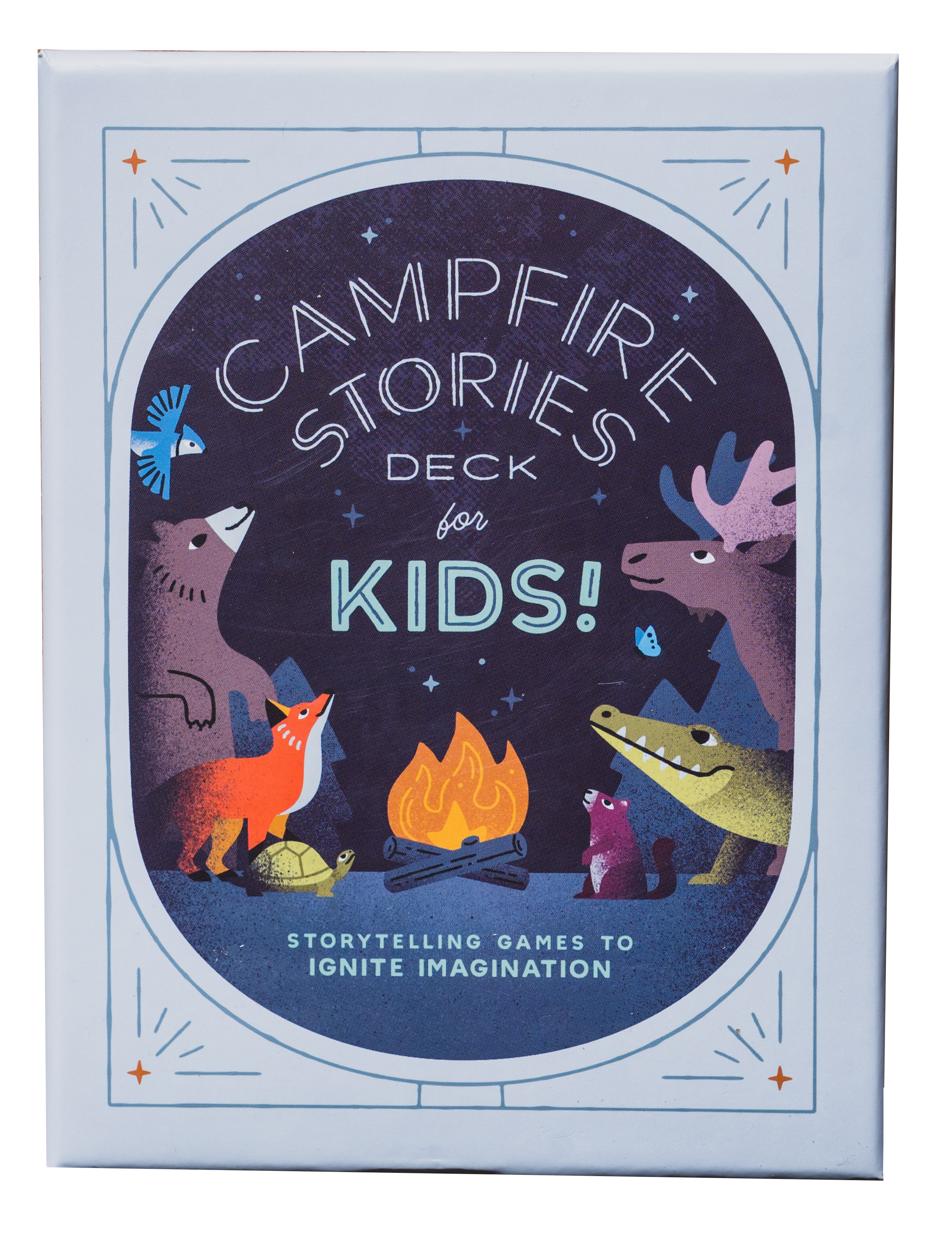 Campfire Stories Deck—For Kids! is a collection of 50 game cards divided into two sets: 25 characters (adjective + noun) and 25 actions (verb + object and/or adverb), each with their own illustrated cards, including 25 animal heroes.